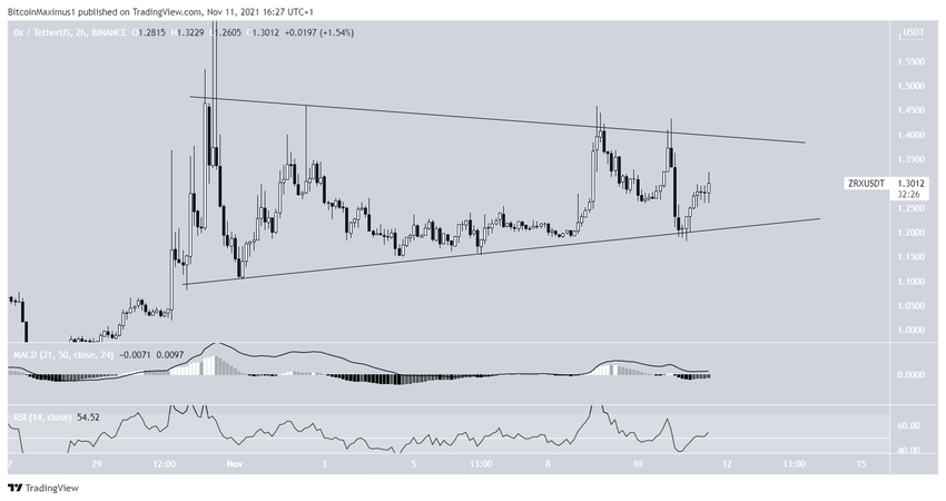 Krótkoterminowy wykres dwugodzinny pokazuje, że ZRX handluje wewnątrz trójkąta symetrycznego. Trójkąt jest uważany za neutralną formację, co oznacza, że zarówno wybicie jak i załamanie są równie prawdopodobne.