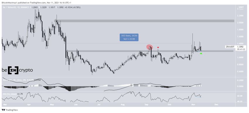 W dniu 30 października ZRX przełamał horyzontalny obszar oporu 1,18 USD. Z wyjątkiem odchylenia w dniu 5 września (czerwone kółko), ZRX notowany był poniżej tego obszaru przez 163 dni. Ponieważ spadł poniżej tego obszaru, a nawet został odrzucony od niego (czerwona ikona) kilka dni później, obszar oporu pozostawał ważny. Po wybiciu, ZRX powrócił do potwierdzenia obszaru jako wsparcia (zielona ikona) i odbił się.