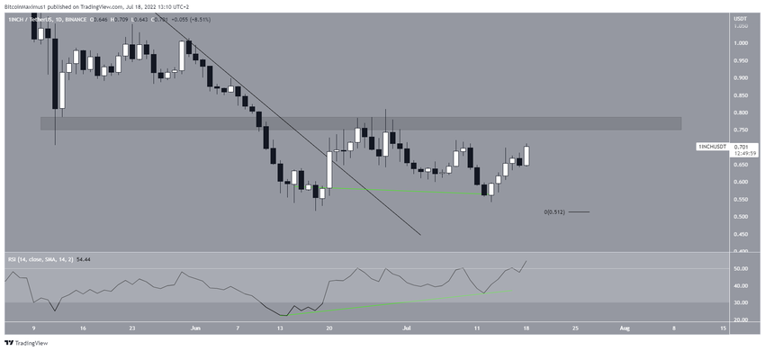 1INCH spadał pod opadającą linią oporu od początku kwietnia. Ten spadek doprowadził do dołka na poziomie 0,51 USD w dniu 18 czerwca. Od tego czasu cena wzrasta. Następnie trzy dni później wybiła się powyżej wspomnianej linii, prawdopodobnie wskazując, że ruch spadkowy jest zakończony.