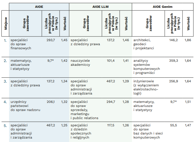 Polski Instytut Ekonomiczny (PIE) zbadał wpływ sztucznej inteligencji na stanowiska pracy Polaków. Wynika z niego, że niektóre stanowiska mogą zostać uproszczone, a niektóre z nich całkowicie znikną. PIE wyróżnił 20 grup zawodów, na które najbardziej może wpłynąć AI. Dominują w nich zawody specjalistyczne, takie jak finansiści, prawnicy, urzędnicy państwowi, czy specjaliścy ds. administracji lub programiści.