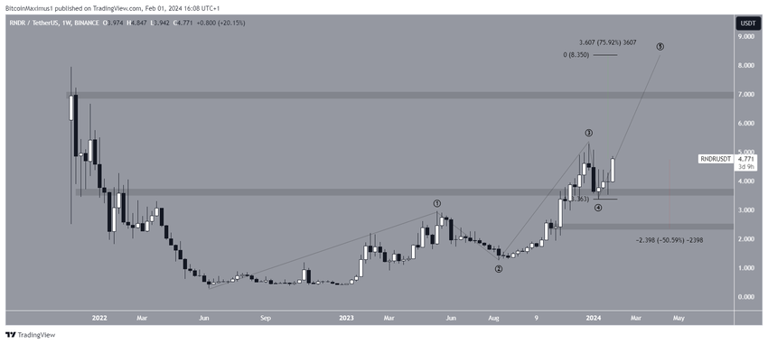 Analiza techniczna tygodniowych interwałów pokazuje, że RNDR wzrósł w pięciofalowym ruchu wzrostowym od czerwca 2023 roku. Jeśli liczenie jest prawidłowe, RNDR znajduje się w piątej i ostatniej fali tego ruchu w górę.