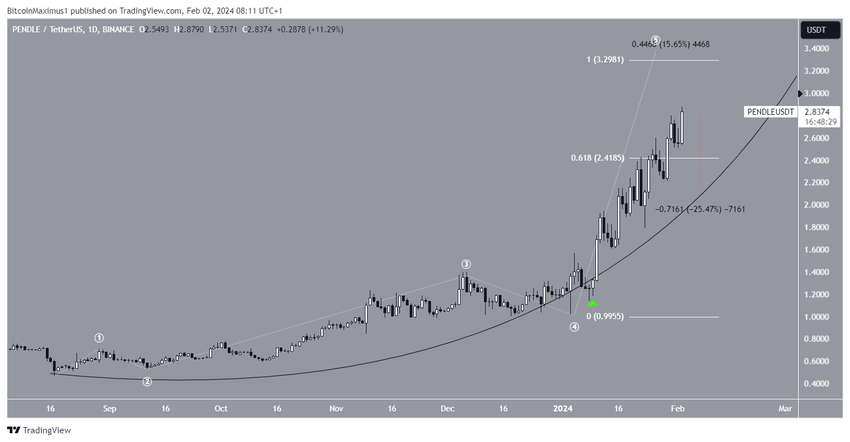 Cena PENDLE wzrosła wraz z paraboliczną rosnącą linią trendu wsparcia od sierpnia 2023 roku. Linia trendu była wielokrotnie weryfikowana, ostatnio 10 stycznia 2024 r. (zielona ikona). Tempo wzrostu przyspieszyło jeszcze bardziej po odbiciu.