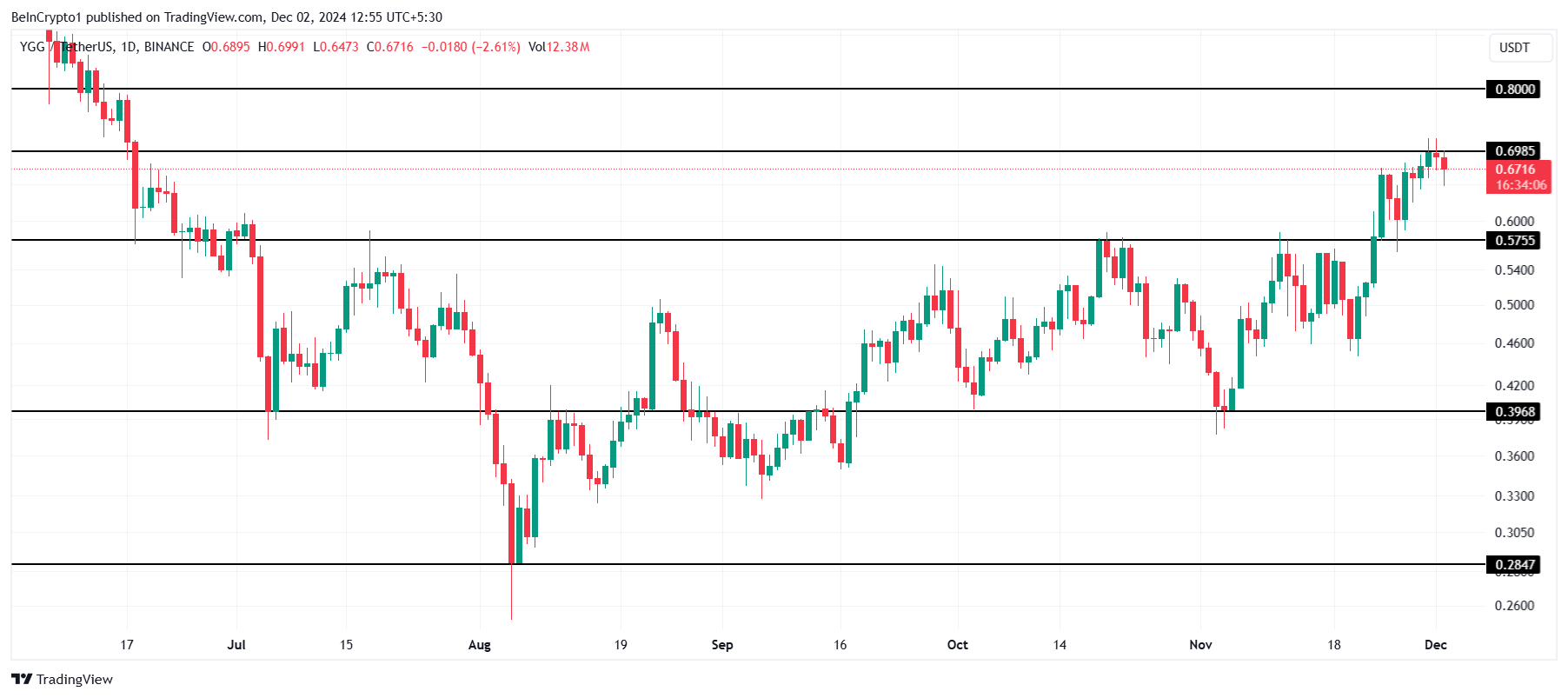 Cena YGG pozostaje poniżej oporu 0,70 USD i ma trudności z przebiciem tego kluczowego poziomu. Aby altcoin mógł wzrosnąć do 0,80 USD, potrzebuje silnego impulsu.