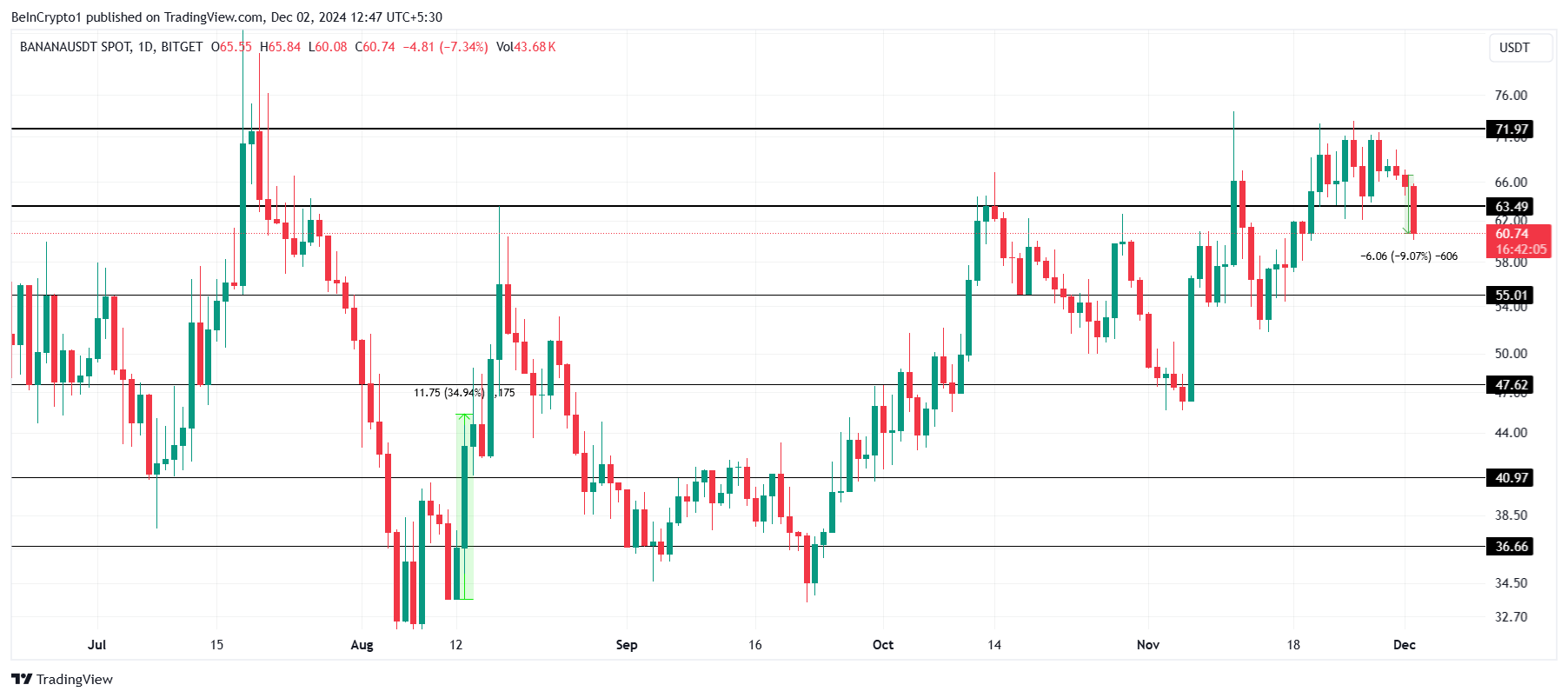 Cena BANANA spadła o 9% w ciągu ostatnich 24 godzin, sprowadzając altcoin do 60 USD. Ten spadek odzwierciedla sentyment rynkowy, ale cena pozostaje powyżej kluczowych poziomów wsparcia.