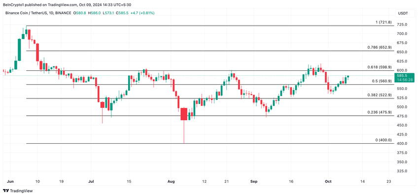 BNB odnotował 5% wzrost w ciągu ostatniego tygodnia, zbliżając się do długoterminowego poziomu oporu 598,90 USD. W chwili pisania tego tekstu altcoin jest notowany po 585,50 USD i wydaje się gotowy do kontynuowania wzrostu.