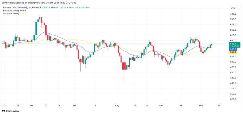 Przy obecnej cenie BNB notowany jest powyżej swojej 20-dniowej wykładniczej średniej kroczącej (EMA) i 50-dniowej małej średniej kroczącej (SMA).