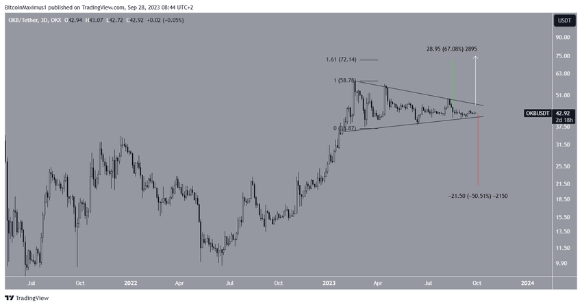 Pomimo tej byczej prognozy dla ceny OKB, wybicie z trójkąta unieważni tę kalkulację. W takim przypadku cena może spaść o 50% do 21 USD.