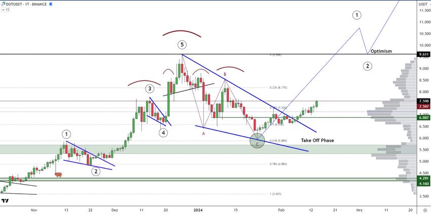 Cena DOT spadła poniżej opadającej linii trendu oporu od 25 grudnia 2023 roku. Spadek ten doprowadził do dołka na poziomie 5,98 USD w dniu 23 stycznia 2024 roku.