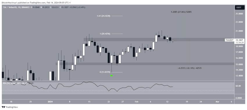 Cena TIA wzrosła od 23 stycznia, kiedy to odbiła się od poziomego obszaru wsparcia 15 USD (zielona ikona). Ruch w górę doprowadził do nowego ATH na poziomie 21,15 USD w dniu 10 lutego.