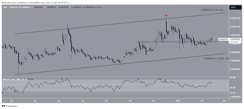 Jeśli SHIB będzie kontynuował wzrosty, może osiągnąć linię trendu oporu kanału na poziomie 0,0000125 USD, czyli 32% powyżej obecnej ceny.