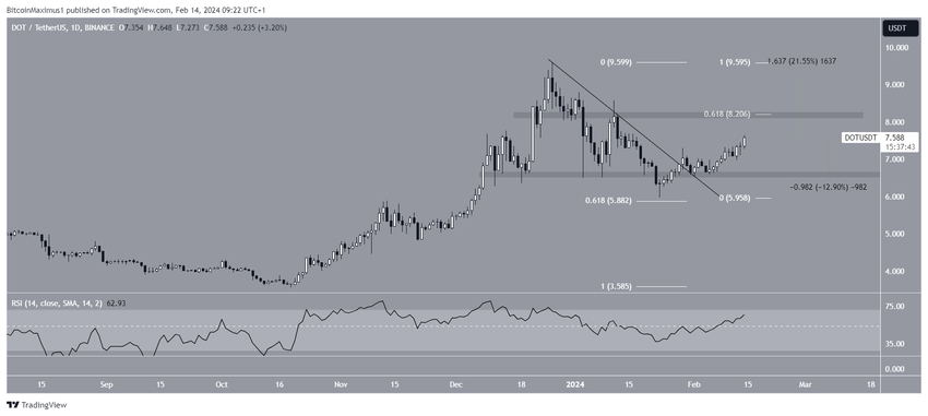 Pomimo byczej prognozy ceny DOT, odrzucenie poziomu 8,20 USD może spowodować spadek o 13% z powrotem do obszaru wsparcia na 6,60 USD.