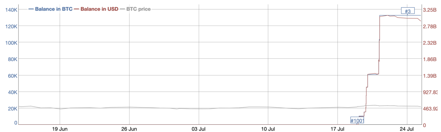 Portfel został utworzony 14 czerwca. Przez długi czas prawie nic się z nim nie działo, aż do momentu, gdy 19 lipca zdeponowano dużą liczbę Bitcoinów. Około godziny 2 w nocy tego dnia na ten portfel przelano nie mniej niż 3 tysiące monet. W tamtym czasie miały one wartość około 67 milionów dolarów.