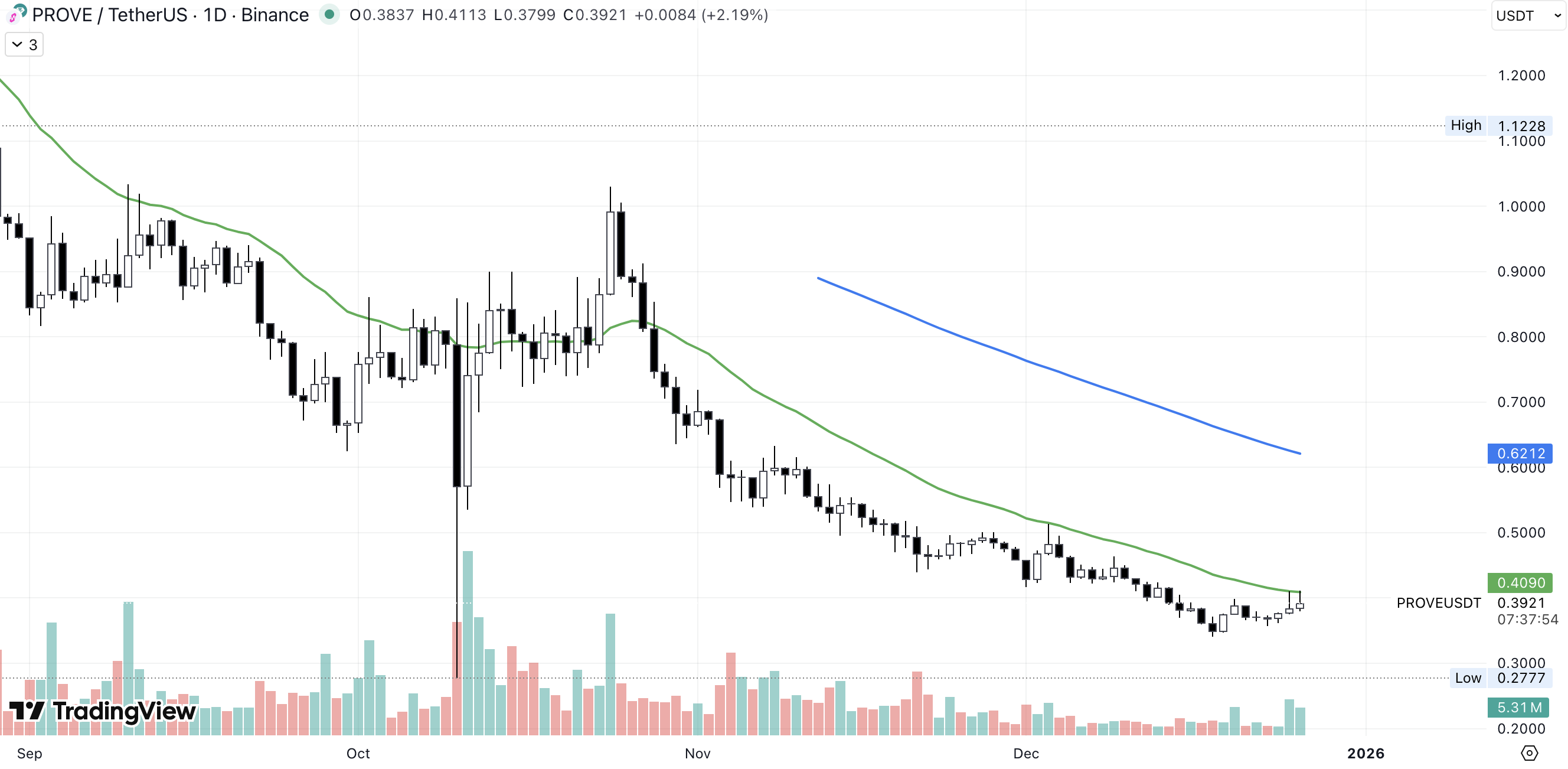 Kapitalizacja rynkowa PROVE wynosi obecnie 75,6 mln USD. Jednak jego cena spadła o ponad 77% po notowaniach na Binance i Coinbase.