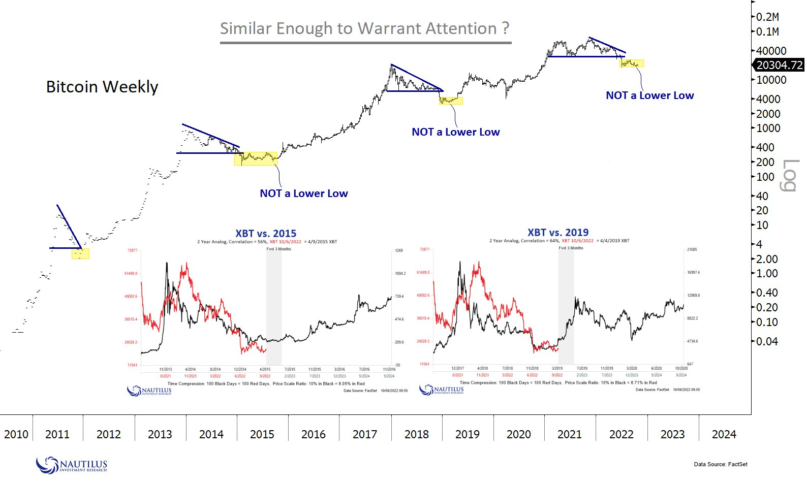 Porównując z poprzednimi cyklami, widzimy, że dotychczasowy spadek był łagodniejszy niż w poprzednich dwóch rynkach niedźwiedzia. W 2014 roku cena Bitcoina spadła o 86% względem historycznego ATH na poziomie 1177 USD. Natomiast w 2018 spadła o 84% względem poprzedniego ATH na 19 764 USD.