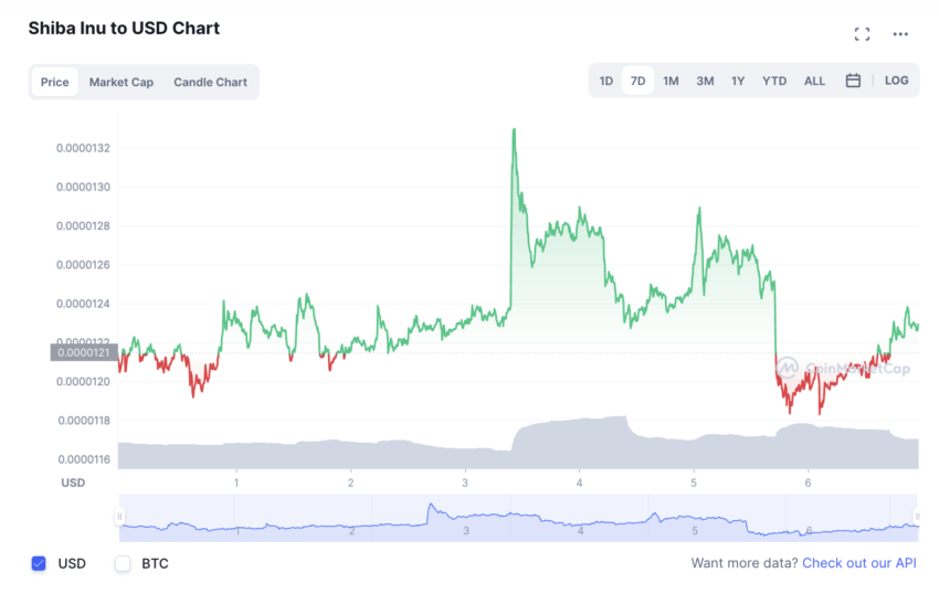 Dane z CoinMarketCap pokazują skokowy wzrost ceny Shiba Inu (SHIB). Urosła ona z poziomu 0,0000133 USD do 0,0000123 USD w mniej niż 24 godziny. Dni temu wieloryby Ethereum kupiły ponad 643 miliardy tokenów SHIB o wartości 8 milionów dolarów.