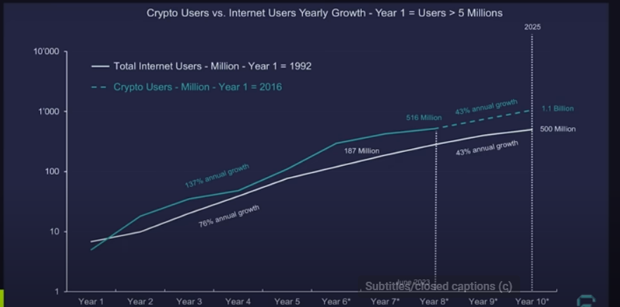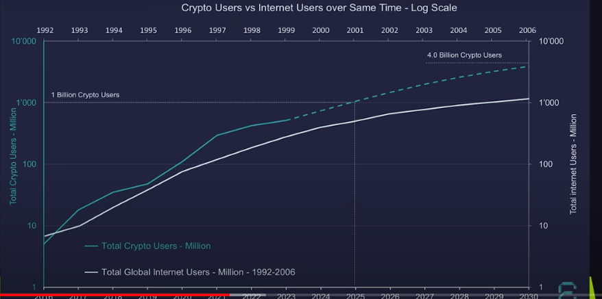 W chwili pisania tego tekstu widzimy na powyższym wykresie, że adopcja Bitcoina przyspiesza szybciej niż adopcja Internetu. Nawet jeśli założymy, że będzie ona w nadchodzących latach, osiągniemy 4 miliardy użytkowników około 2030 roku. – Oblicza Raoul Pal.