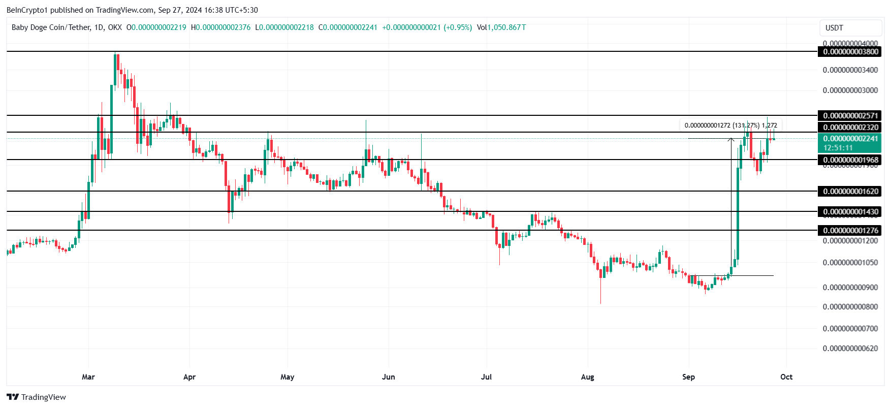 Te opory powstrzymywały BabyDoge od kwietnia tego roku, a wzrost mógł wysłać kryptoaktywo na drogę do osiągnięcia 0.000000003800 USD. To poziom obecnego rekordu ceny dla tego memecoina, a nadchodzący „Uptober” może sprzyjać wzrostowi do tego poziomu.