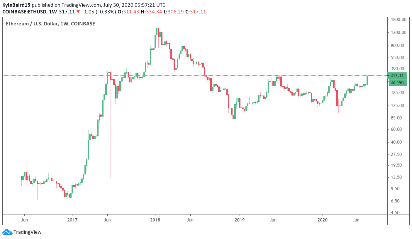 W dłuższej perspektywie czasowej Ethereum ma nadzieję na ewolucję w kierunku całego finansowego ekosystemu poprzez proof-of-stake, w którym gracze instytucjonalni będą mogli korzystać z możliwości zarobkowania. Jeśli duże ilości ETH zostaną wykupione w ramach przygotowań do gry, szok podażowy może spowodować, że ceny będą znacznie wyższe niż 300 dolarów, które są obecnie.
