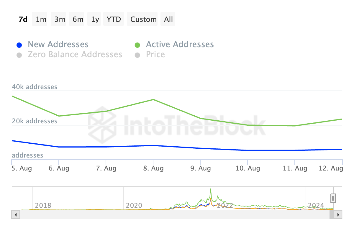 Zgodnie z danymi od IntoTheBlock dzienna liczba aktywnych adresów, które zrealizowały przynajmniej jedną transakcję z ADA, spadła o 36% w ciągu ostatniego tygodnia. Podobnie liczba nowych adresów stworzonych do handlu tą kryptowalutą również zmalała o 46%.