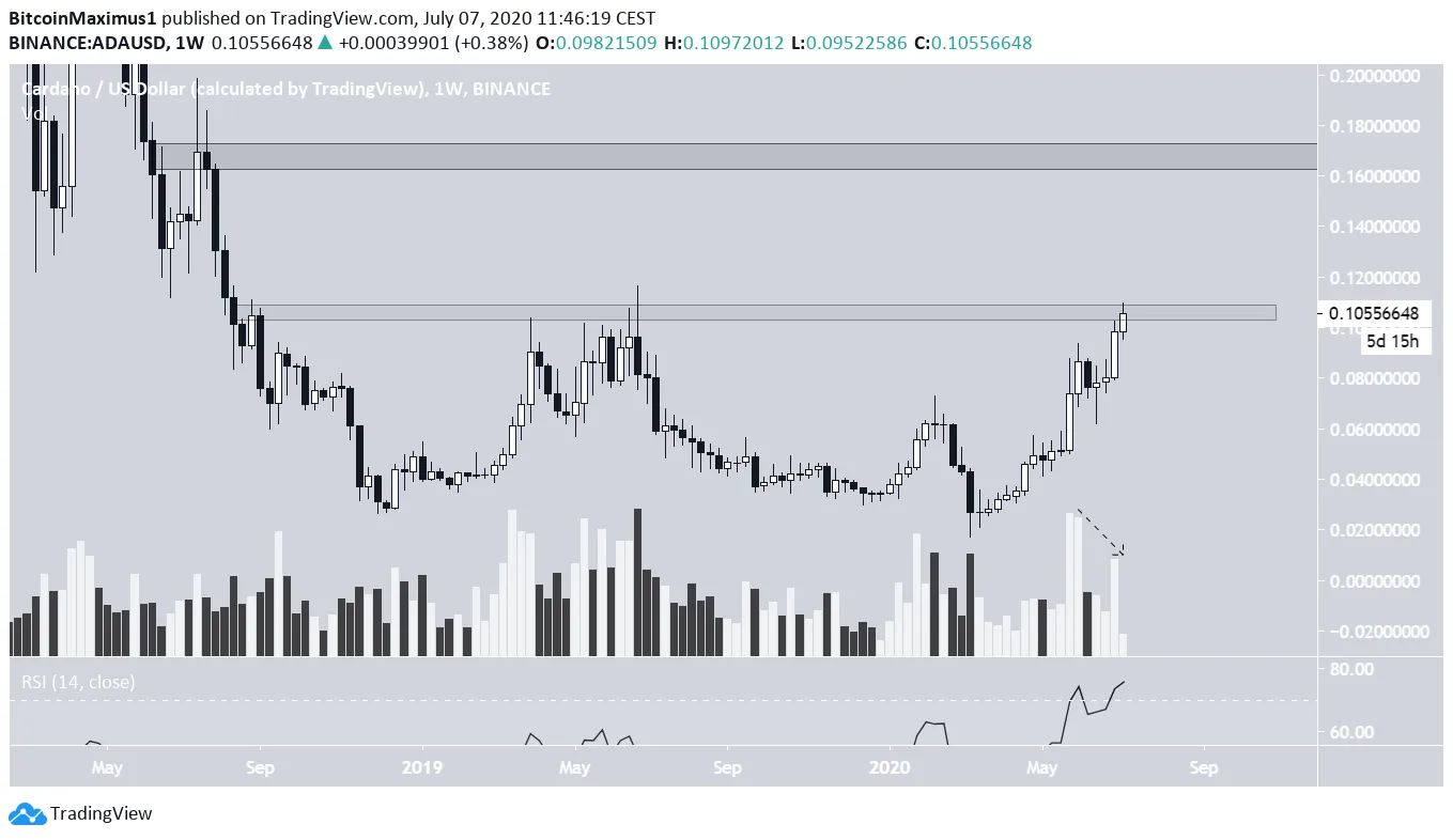 Tygodniowy wykres pokazuje, że ADA znajduje się w obszarze oporu 0,105 USD, który obowiązuje od września 2018 r. Chociaż szczyt jednego knota osiągnął poziom ponad tym oporem w 2019 r., to jednak nigdy nie udało się zamknąć ceny powyżej.