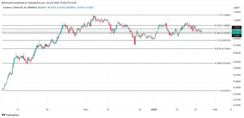 W momencie pisania tego tekstu, cena ADA traduje na poziomie 0,99 USD. Jeśli trend akumulacji się utrzyma, wówczas może to podnieść cenę altcoina powyżej jego poziomu oporu wynoszącego 1,02 USD. Wzmożone napływy inwestycyjne dużych portfeli, gdy pojawił się sygnał kupna mogą sprawić, że udane przebicie tego istotnego poziomu otworzy drogę altcoinowi do wzrostu do 1,08 USD.