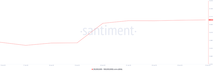 Atrakcyjność ceny Cardano (ADA) spowodowała wzrost aktywności rynkowej. Dodatkowo, pojawił się ten sygnał kupna, a to przyciągnęło uwagę wielorybów ADA, którzy niedawno zaczęli gromadzić znaczne ilości monety. Co więcej, według danych od Santiment, adresy wielorybów posiadające od 10 mln do 100 mln ADA zakupiły oszałamiającą ilość monet o wartości 140 mln USD w ciągu ostatnich siedmiu dni.