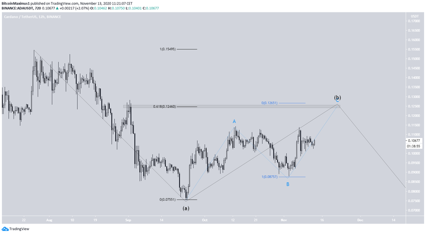 Fala B tworzy się wewnątrz formacji podfali A-B-C (niebieskiej), w której cena jest w ostatniej fali C. Rzutowanie długości fali podrzędnej A na C daje nam docelowy poziom 0,125 USD jako szczyt ruchu. Jest to zgodne zarówno z obszarami oporu zarysowanymi w pierwszej sekcji, jak i krótkoterminowym wybiciem z trójkąta.