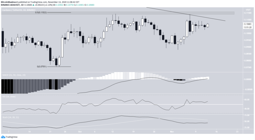 Mimo że od tego czasu cena rośnie, to jeszcze nie wybiła się z poprzedniej opadającej linii oporu. Ponadto linia pokrywa się z obszarem oporu na 0,115 USD, który dotychczas dwukrotnie odrzucił cenę i jest poziomem 0,5 Fib całego ruchu w dół.