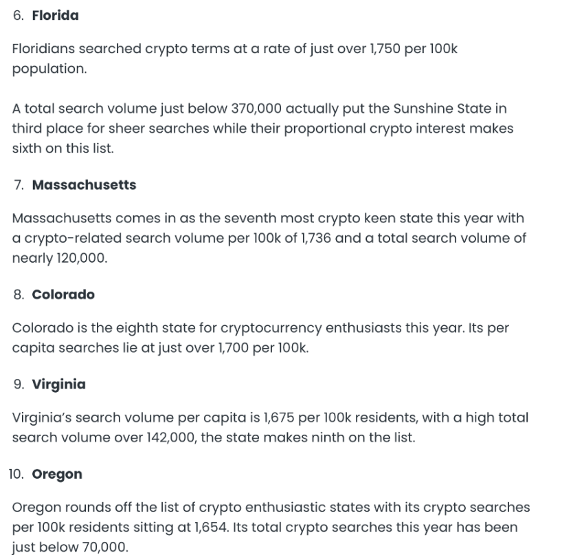 “Srebrny Stan przeprowadził wyszukiwania związane z kryptowalutami w proporcji prawie dwóch tysięcy na 100 000 mieszkańców, co jest najwyższym wskaźnikiem w Ameryce.”