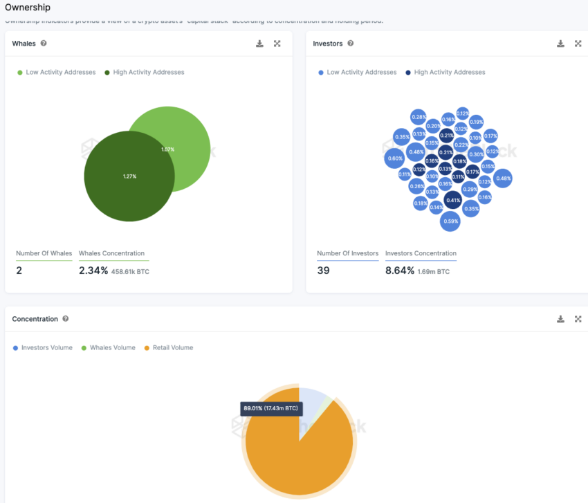 Zdecydowana większość BTC (89%) znajduje się w rękach inwestorów detalicznych. Są to adresy, z których każdy posiada mniej niż 0,1% podaży. Istnieją tylko dwa adresy wielorybów, które posiadają więcej niż 1% podaży.