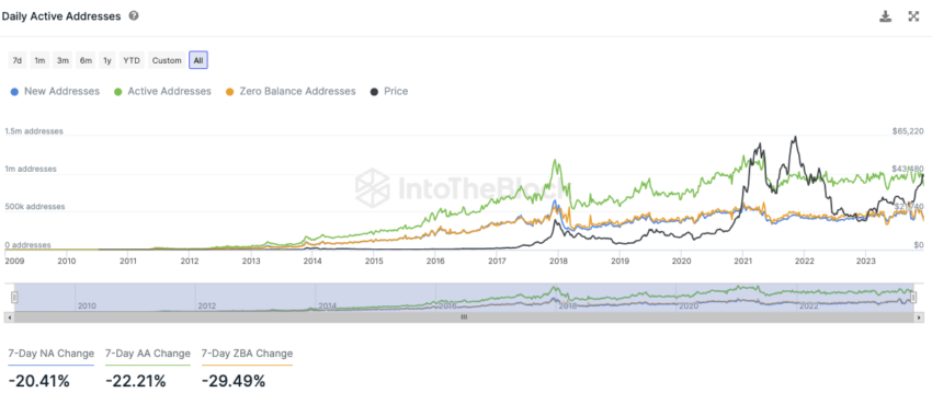 Niemniej jednak aktywność sieci spadła w ciągu ostatnich siedmiu dni. Liczba nowych adresów BTC spadła o około 20,4%, podczas gdy liczba aktywnych adresów BTC spadła o około 22,2%.