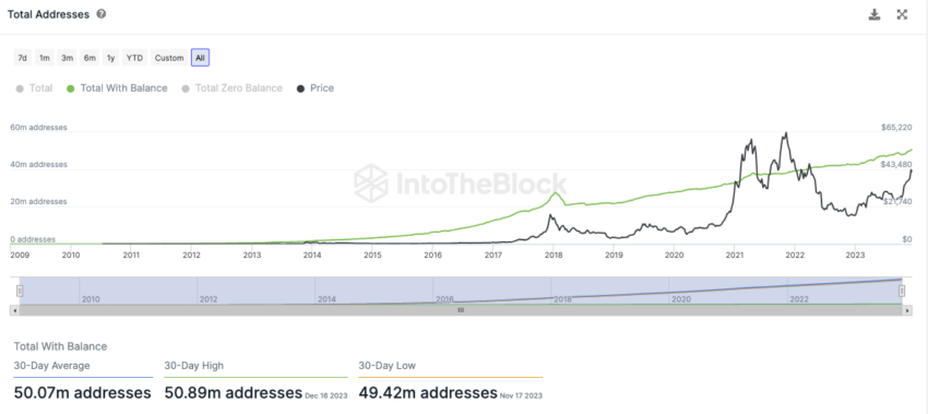 Całkowita liczba adresów BTC wykazuje jednak stałą tendencję wzrostową. W ciągu ostatnich 30 dni było to średnio 50 milionów adresów BTC.