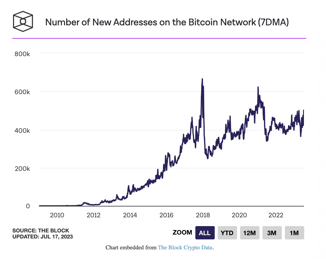 Siedmiodniowa średnia dla liczby nowych adresów w blockchainie Bitcoina przekroczyła 500 000 po raz pierwszy w tym roku. Wcześniej rekord wszech czasów dla tej statystyki odnotowano 8 kwietnia na poziomie 499 000. Jednak 12 lipca liczba ta wzrosła do 501 440, – oznacza to najwyższy poziom od maja 2021 roku.