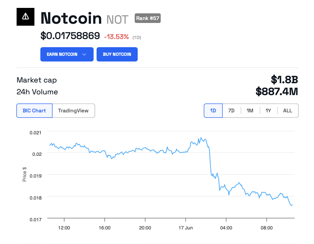 Według danych BeInCrypto, wartość NOT wzrosła o ponad 164% w ciągu ostatniego miesiąca. W chwili pisania tego tekstu token jest notowany na poziomie 0,0175 USD po utracie 13,5% w ciągu ostatnich 24 godzin.