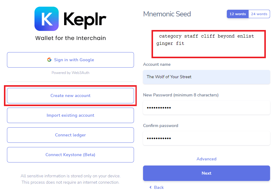- Zapisz frazę seed w bezpiecznym miejscu i wymyśl hasło.