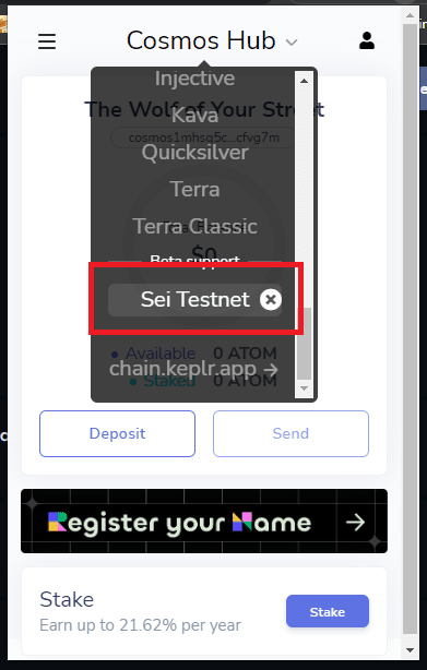 - Przejdź do portfela Keplr i przełącz sieć.