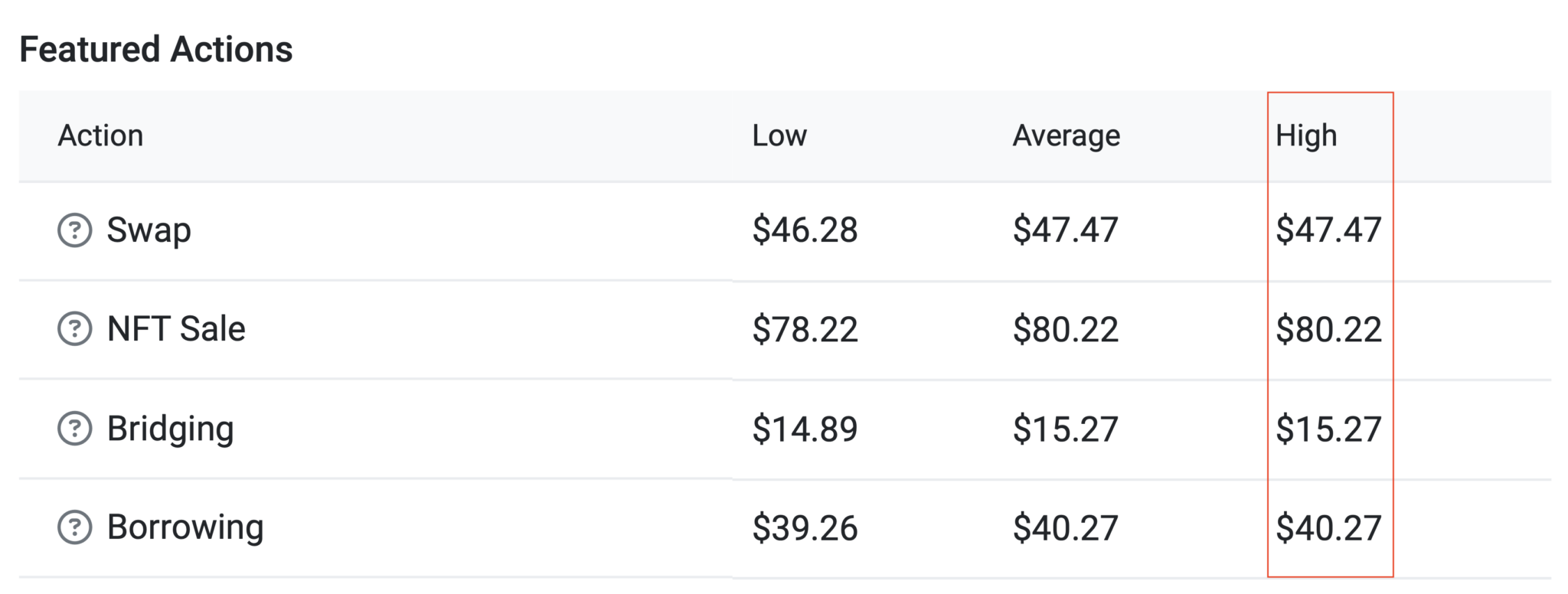 Sieć Base nadal wyróżnia się zbyt wysokimi opłatami. Na przykład dzisiaj, przy stosunkowo niskim koszcie gazu na poziomie 46 gwei, jeden szybki przelew kosztuje równowartość 2,6 USD.