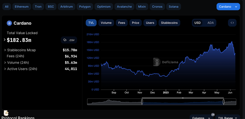 Jednak według danych od BeInCrypto aktywność zdecentralizowanych finansów (DeFi) rośnie w ekosystemie Cardano. Całkowita zablokowana wartość (TVL) znajdowała się w trendzie wzrostowym w ciągu ostatnich 365 dni, obecnie wynosząc 182,83 mln USD.