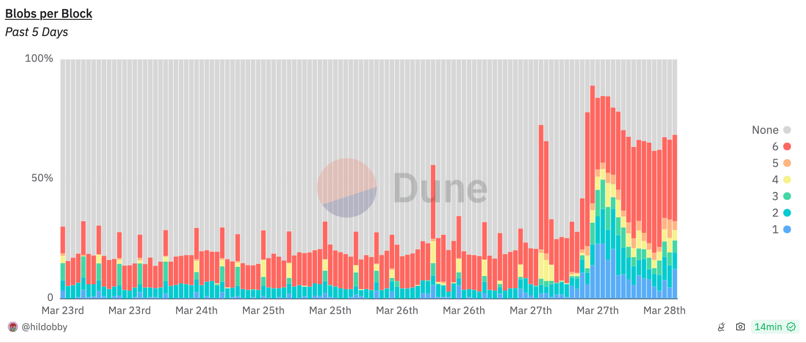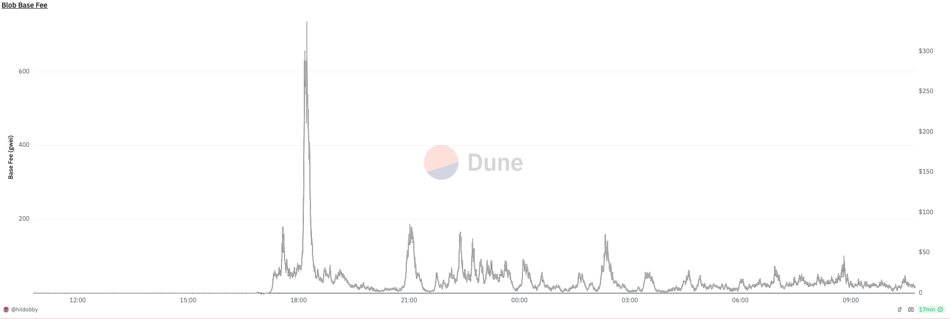 Mniej niż pięć godzin po uruchomieniu BlobScriptions, opłata za gaz blob wzrosła do 585 gwei. To około 18 USD przy ówczesnym kursie ETH.