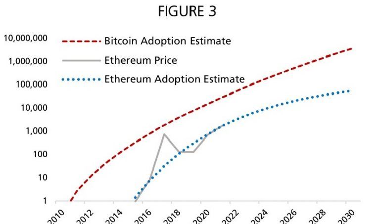Margines błędu jest dość duży, więc szacowana wartość nasycenia dla Ethereum waha się między 75 000- 175 000 USD w ciągu około 15-20 lat (rysunek 3 poniżej).