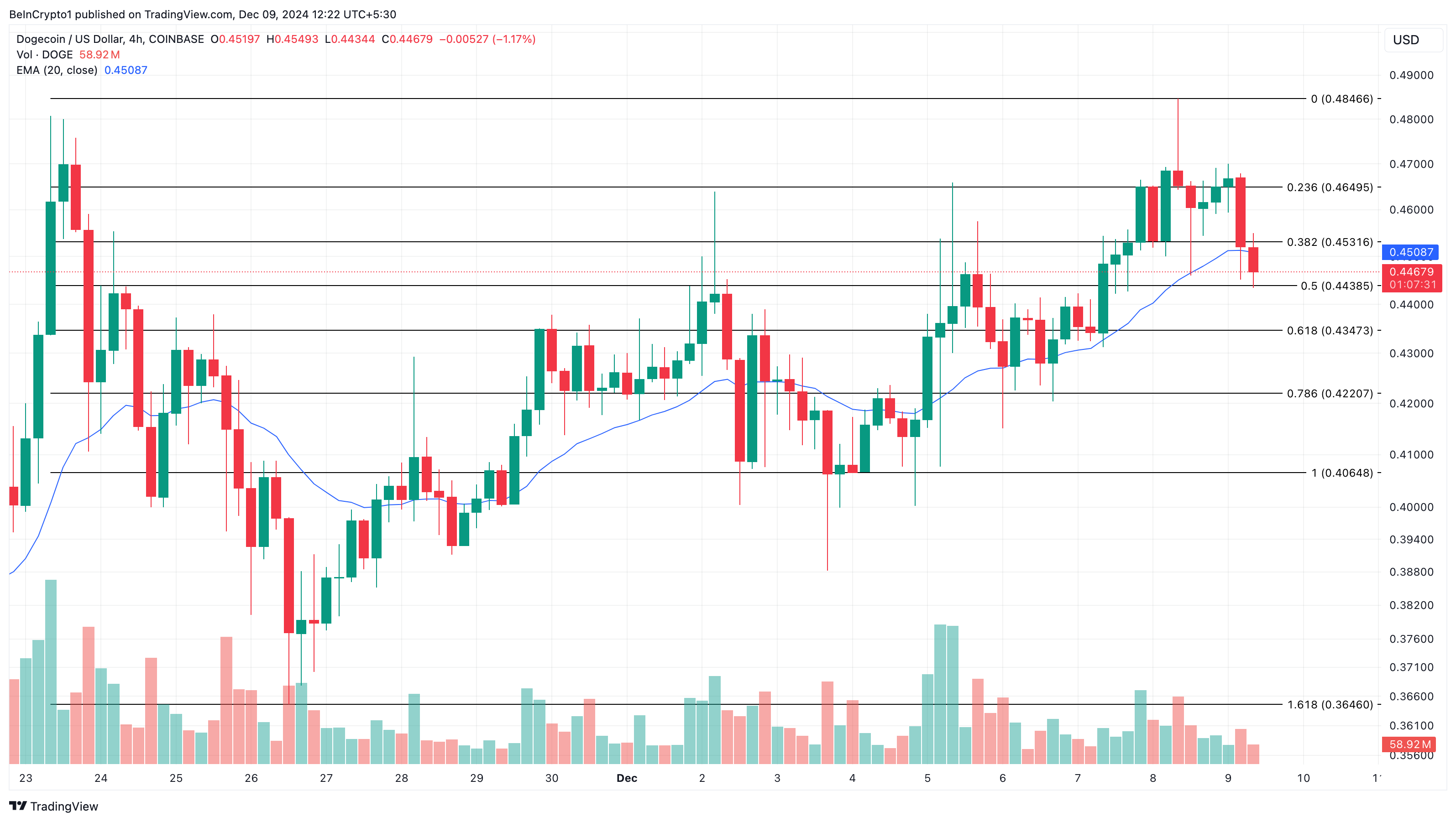 Zgodnie z poniższym obrazem, cena Dogecoin, wynosząca 0,45 USD, jest poniżej 20 EMA (niebieska). Biorąc pod uwagę ten stan, cena memecoina może spaść niżej, a wskaźnik zniesienia Fibonacciego sugeruje, że ruch spadkowy do 0,42 USD.