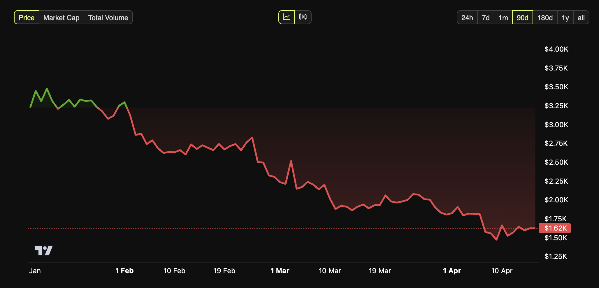 Niemniej jednak zawieszenie ceł wywołało niewielkie odbicie ETH wkrótce potem. W momencie publikacji Ethereum było notowane po 1623 USD, co stanowiło niewielki wzrost o 0,3% w ciągu ostatniego dnia.