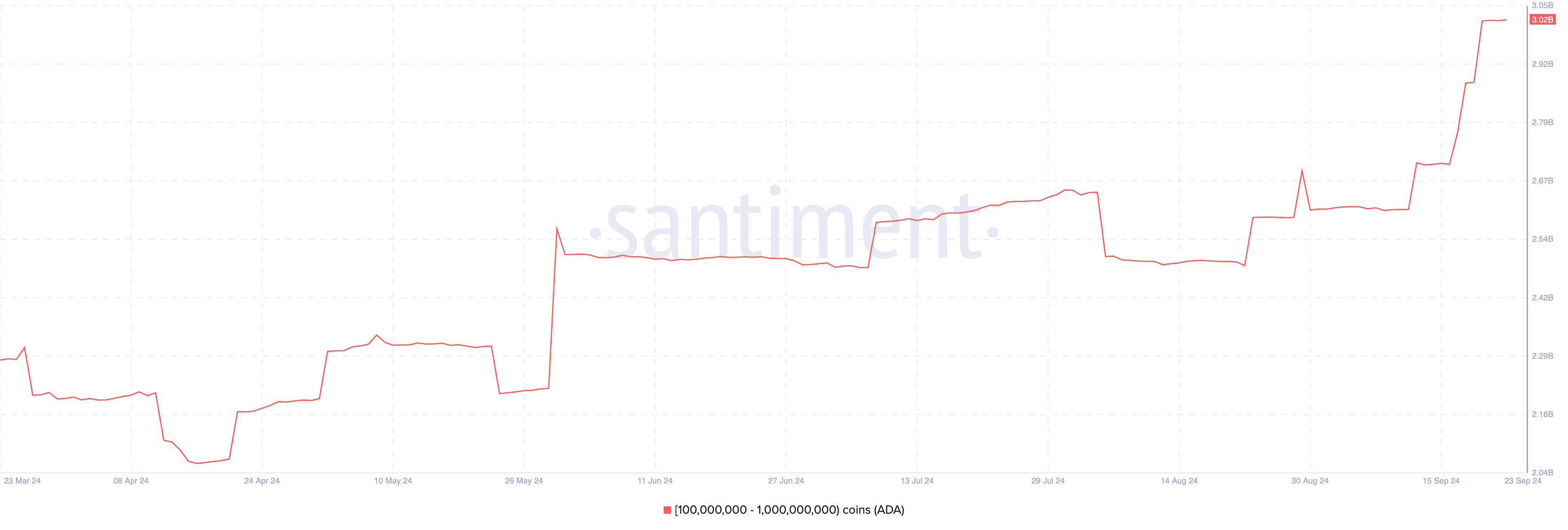 16 września adresy Cardano posiadające między 100 mln a 10 mld tokenów miały łącznie 2,88 mld ADA. Dziś liczba ta wzrosła do 3,02 mld. Oznacza to, że te adresy zgromadziły około 140 mln ADA w ciągu ostatniego tygodnia. Ich łączna wartość wyceniana jest na 49 mln USD.