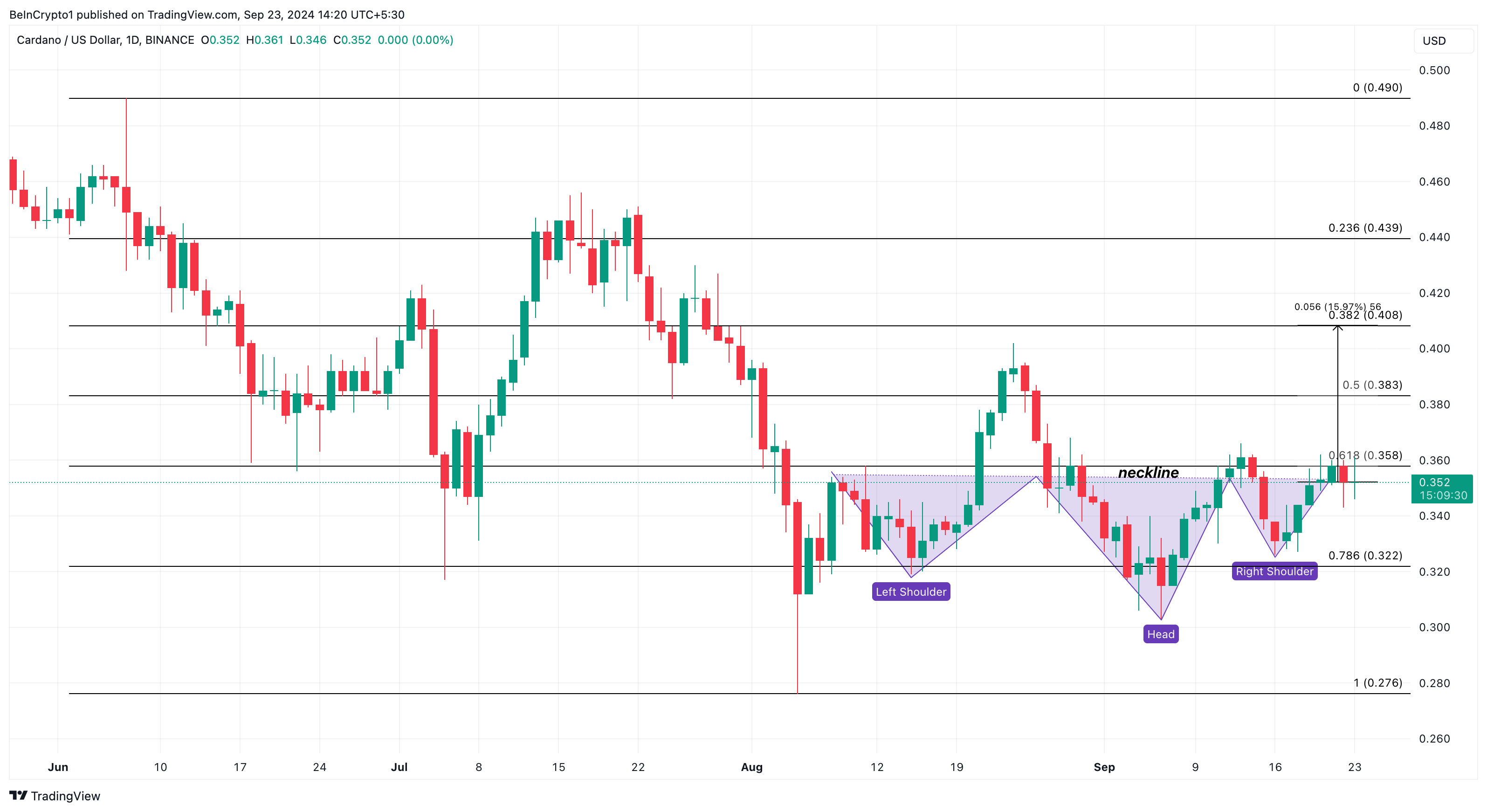 Biorąc pod uwagę wspomnianą akumulację Cardano, ten optymistyczny scenariusz dla ceny ADA musi przebić ją przez linię szyi. Obecnie testuje to na poziomie 0,36 USD. Jeśli cena przetestuje poziom 61,8% Fibonacciego, może nastąpić wzrost o 16%, potencjalnie prowadzący ADA do 0,40 USD.