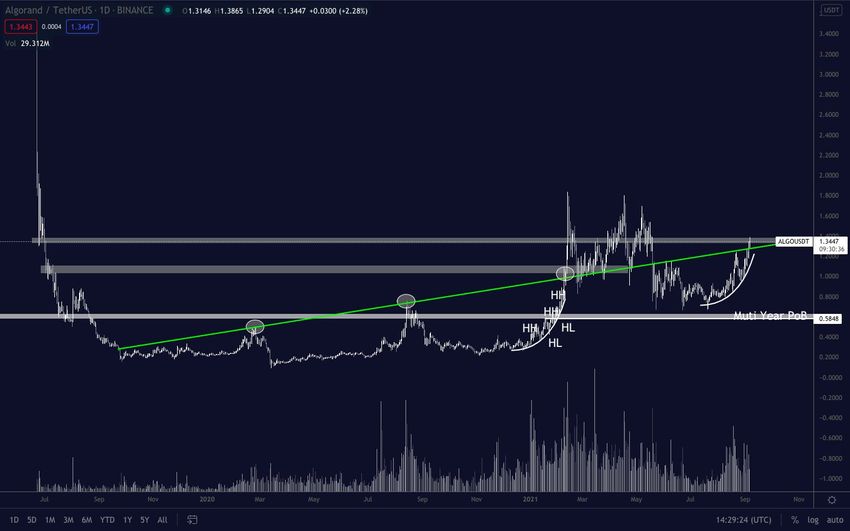 Trader kryptowalutowy @Pentosh1 stwierdził, że ALGO może osiągnąć kolejne nowe roczne szczyty, ponieważ jest bliski wyjścia ponad horyzontalny obszar 1,40 USD.