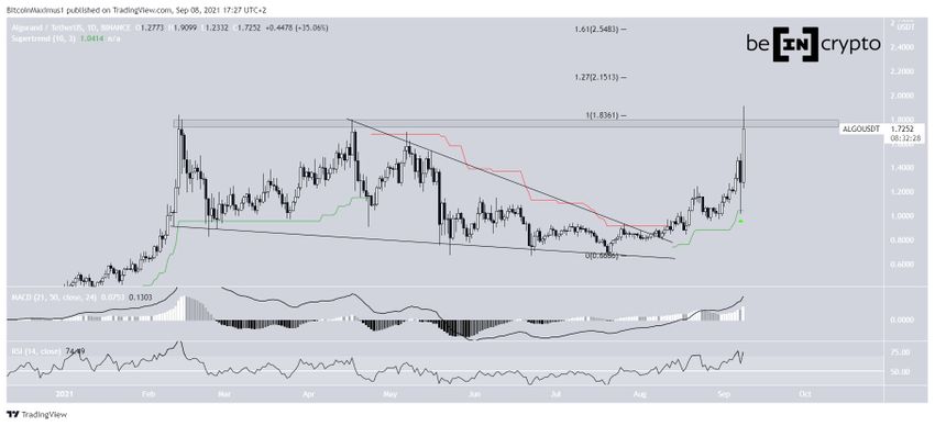W dniu 7 sierpnia Algorand wybił się z klina zniżkującego i od tego czasu porusza się w górę. Spadek z dnia 8 września spowodował jedynie potwierdzenie linii supertrendu jako wsparcia (zielony) i utworzył długi dolny knot.