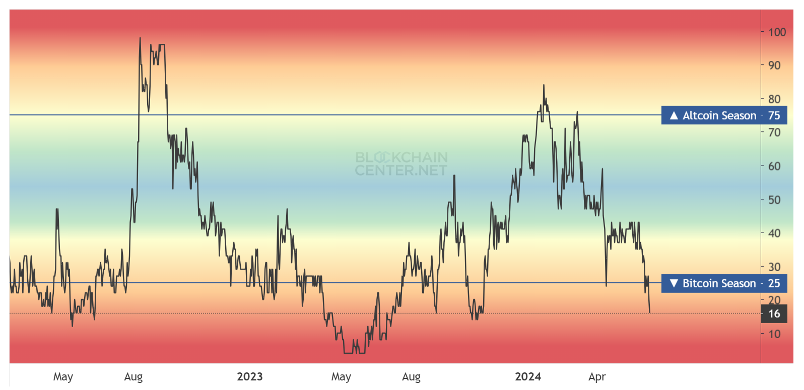 Jednak od 2022 roku pojawił się pewien wzorzec. Sierpień 2022 r. był przedostatnim altcoin sezonem, po którym rozpoczęcie sezonu Bitcoina zajęło sześć miesięcy. Kolejny i ostatni altcoin sezon rozpoczął się osiem miesięcy później, w styczniu tego roku. Teraz, pięć miesięcy później, znów jesteśmy świadkami sezonu na Bitcoina.
