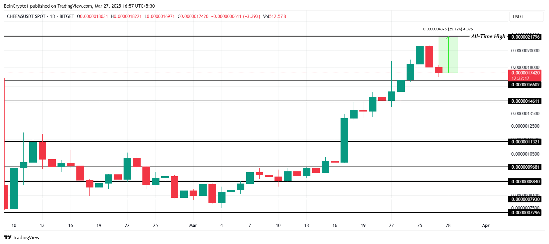 Aby CHEEMS ustanowił nowy ATH powyżej 0,000002200 USD, potrzebuje wzrostu o 25% od obecnej ceny. Altcoin prawdopodobnie odbije się od poziomu wsparcia 0,000001660 USD, co może pomóc w wykorzystaniu obecnego byczego impetu. Utrzymany ruch powyżej tego poziomu może sygnalizować dalszy potencjał wzrostu.