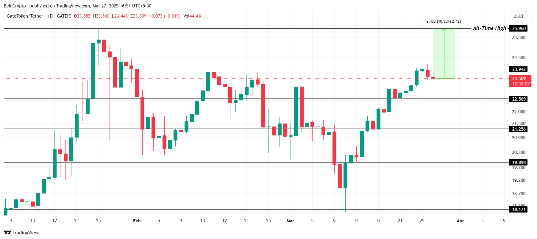 GT obecnie notowany jest na poziomie 23,50 USD, zaledwie 10% od swojego ATH wynoszącego 25,96 USD. Aby osiągnąć ten poziom, altcoin musi przełamać i zamienić 23,94 USD w poziom wsparcia. Udane przełamanie tego oporu może otworzyć drogę do dalszych wzrostów cen.