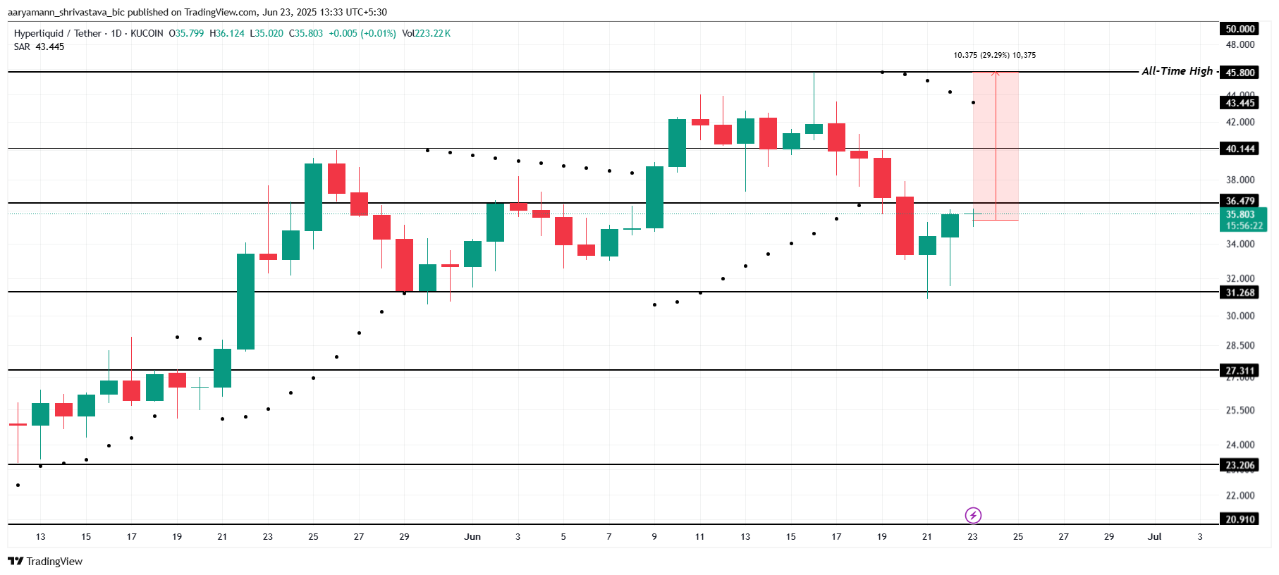 Jednak wskaźnik Parabolic Sar, który znajduje się powyżej świec, sugeruje potencjalny trend spadkowy. Jeśli HYPE nie zdoła przełamać poziomu na 36,4 USD, może spaść do wsparcia na 31,2 USD. To unieważniłoby obecny byczy scenariusz. Utrzymujący się trend spadkowy sygnalizowałby utratę impetu, co mogłoby prowadzić do dalszych spadków dla HYPE.
